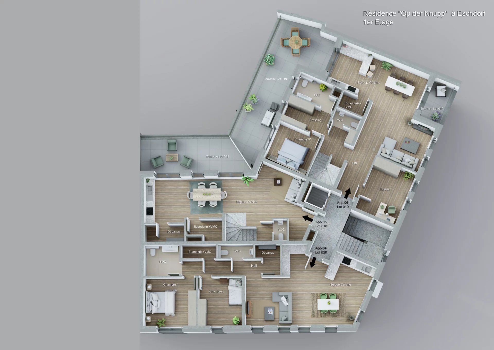 L’agence IMMOBILIERE MARECHAL vous propose en exclusivité un appartement-duplex (lots 019+022) d’une surface habitable de 230,71 m2, situé 1ier et 2ième étage de la Résidence « OP DER KNUPP » à Eschdorf, qui se présente comme suit :