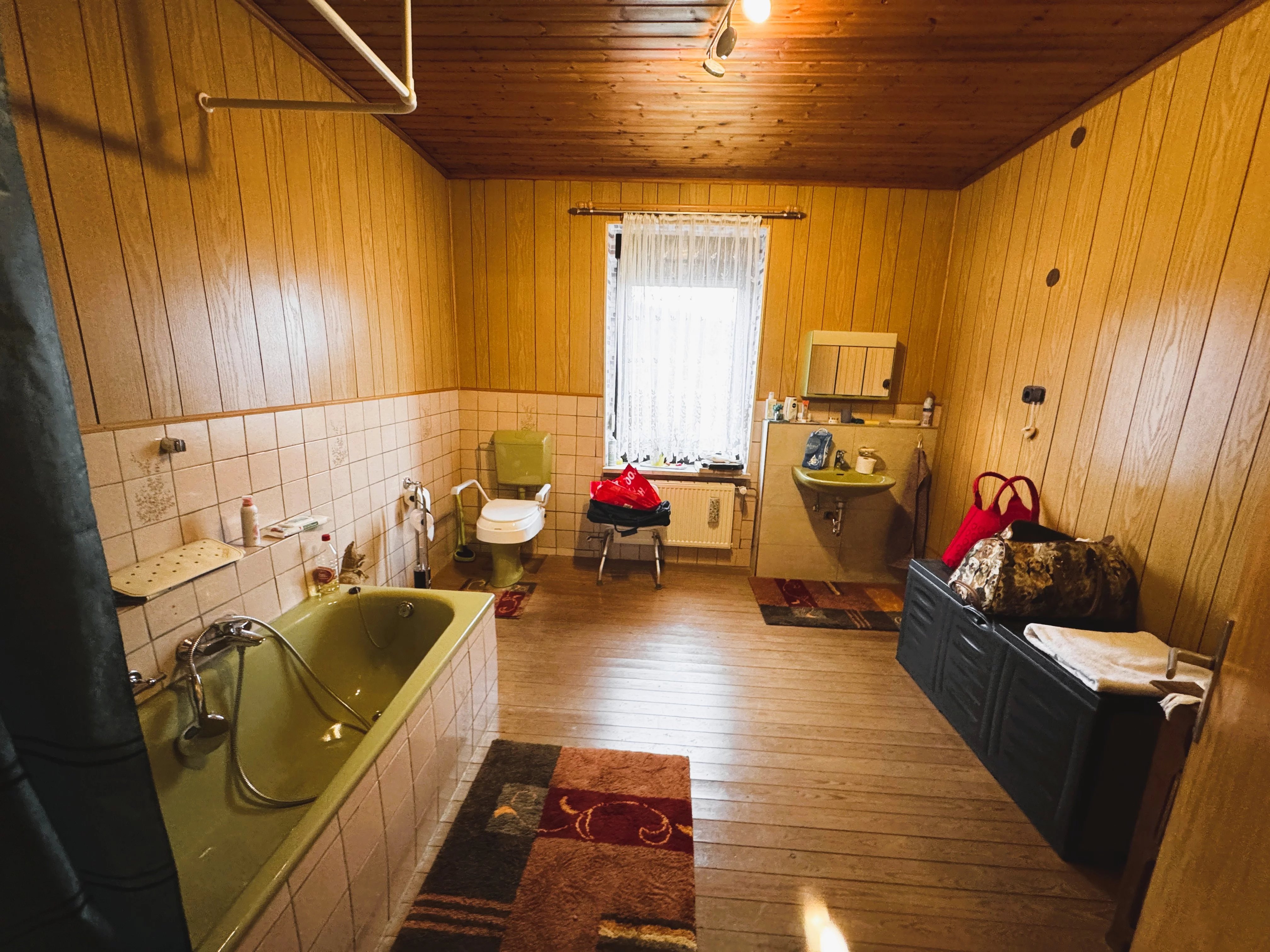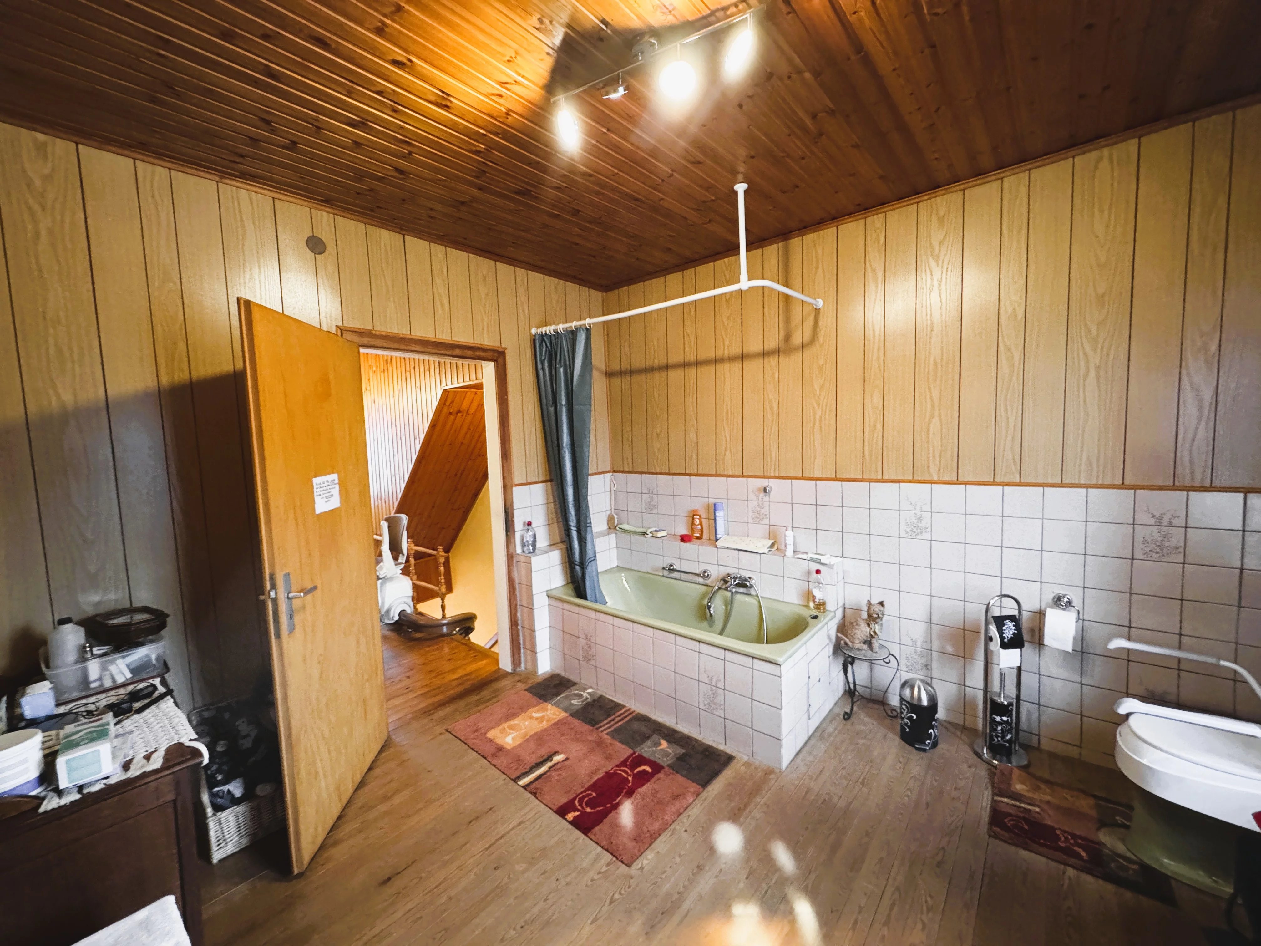 - une salle de bains (avec fenêtre) d’une superficie de +/- 13,00 m2 comprenant une baignoire, un WC, ainsi qu’un lavabo avec miroir.