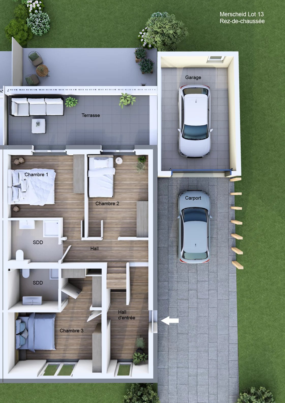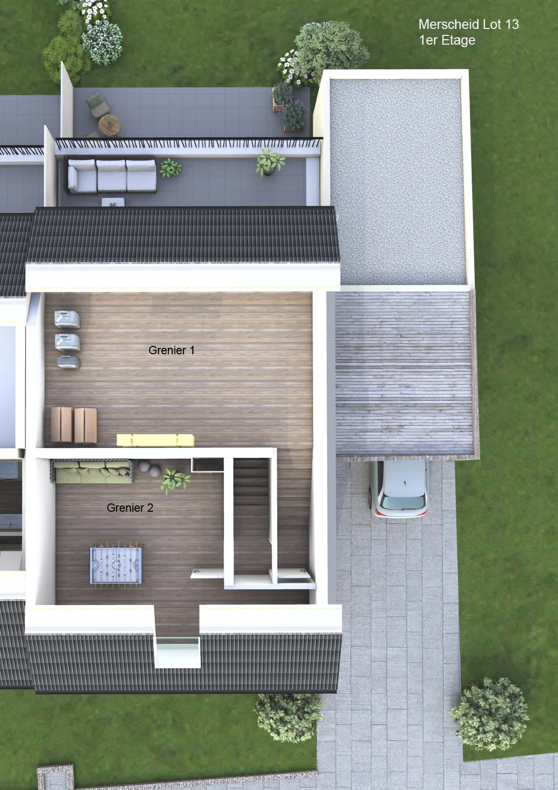 - un garage fermé pour une voiture (21,36 m2), avec emplacement de stationnement supplémentaire devant le garage (carport).