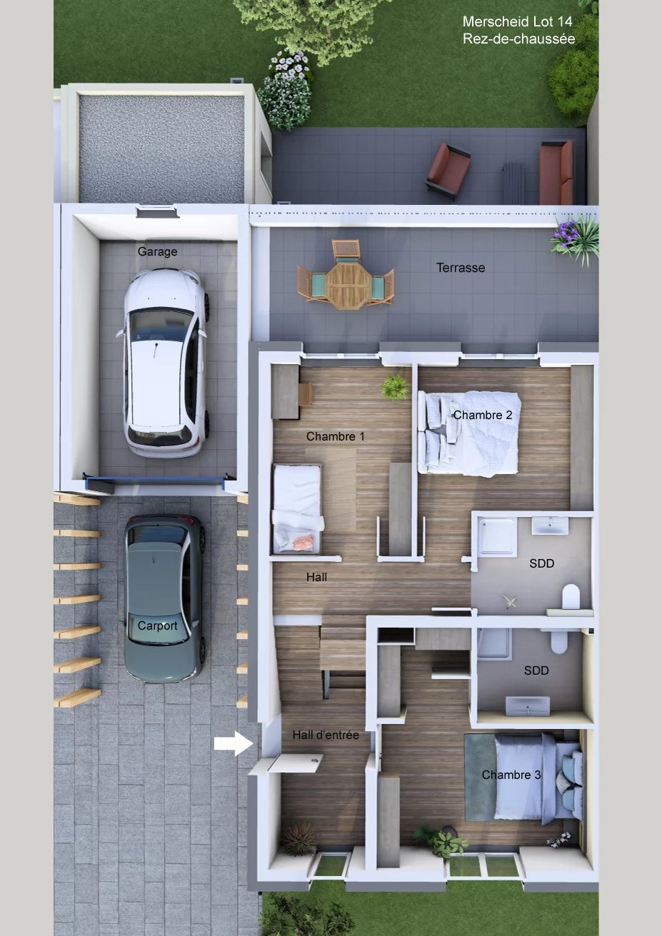 - un garage fermé pour une voiture (20,94 m2), avec emplacement de stationnement supplémentaire devant le garage (carport).